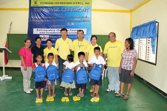 TSUNEISHI FOUNDATION (CEBU),Inc.(ツネイシセブ財団)は、ブアノイ地区の山間部にあるBUHINGTUBIG小学校に校舎を寄贈しました。今までは教室が少なく、高学年の生徒はふもとのブアノイ小学校まで通学していましたが、新校舎には教室が3クラスあり、地元の小学校で授業を受けることができます。9月8日(土)には開校を祝い、新校舎落成式が行われ、同校生徒や校舎の建築に協力してくれた生徒たちの父兄が参加しました。式ではツネイシセブ財団から生徒にサンダルと文具の入ったリュックサックを寄贈しました。